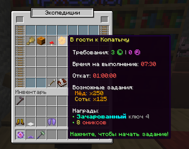 - В инвентаре игрока, в слотах создания, присутствуют полезные кнопки и прогресс экспедиции